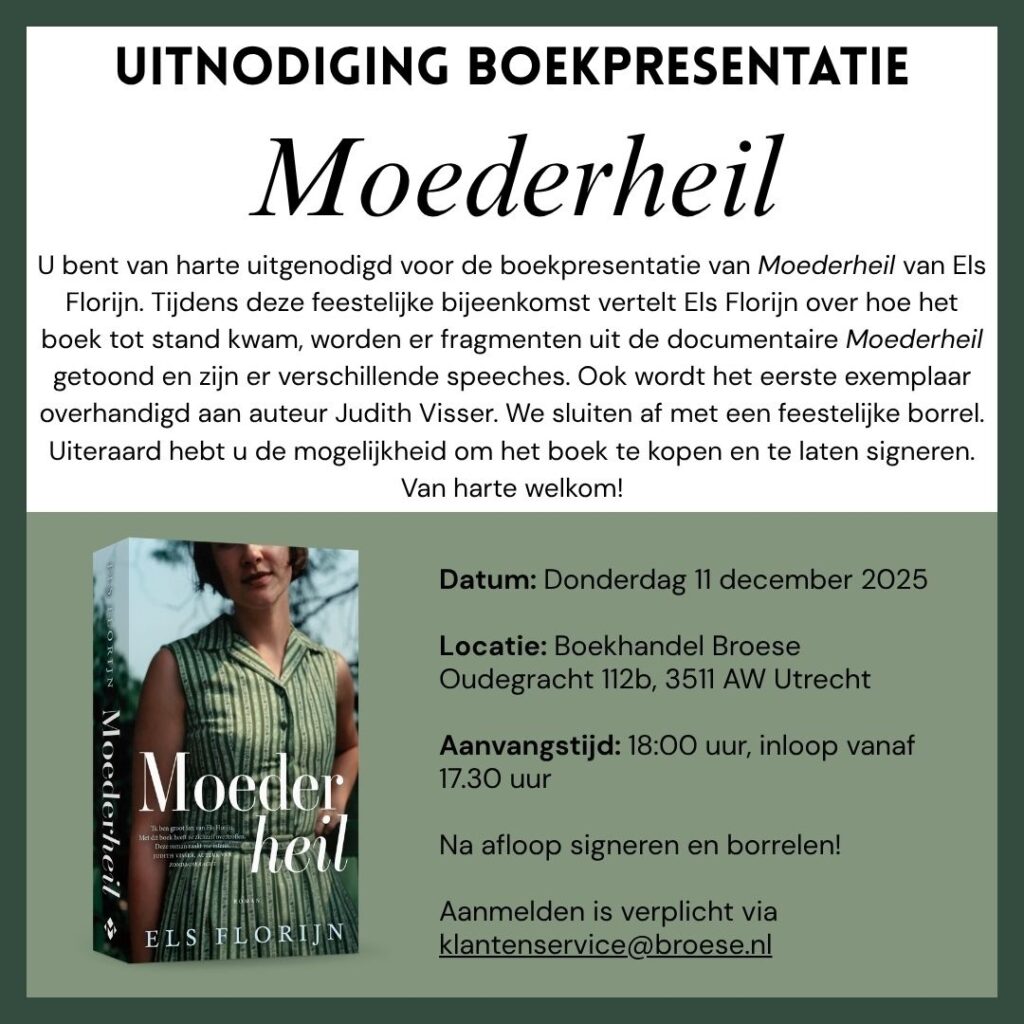 Op donderdag 11 december geeft Els Florijn een boekpresentatie over haar nieuwe roman Moederheil in boekhandel Broese in Utrecht. Ben jij erbij?