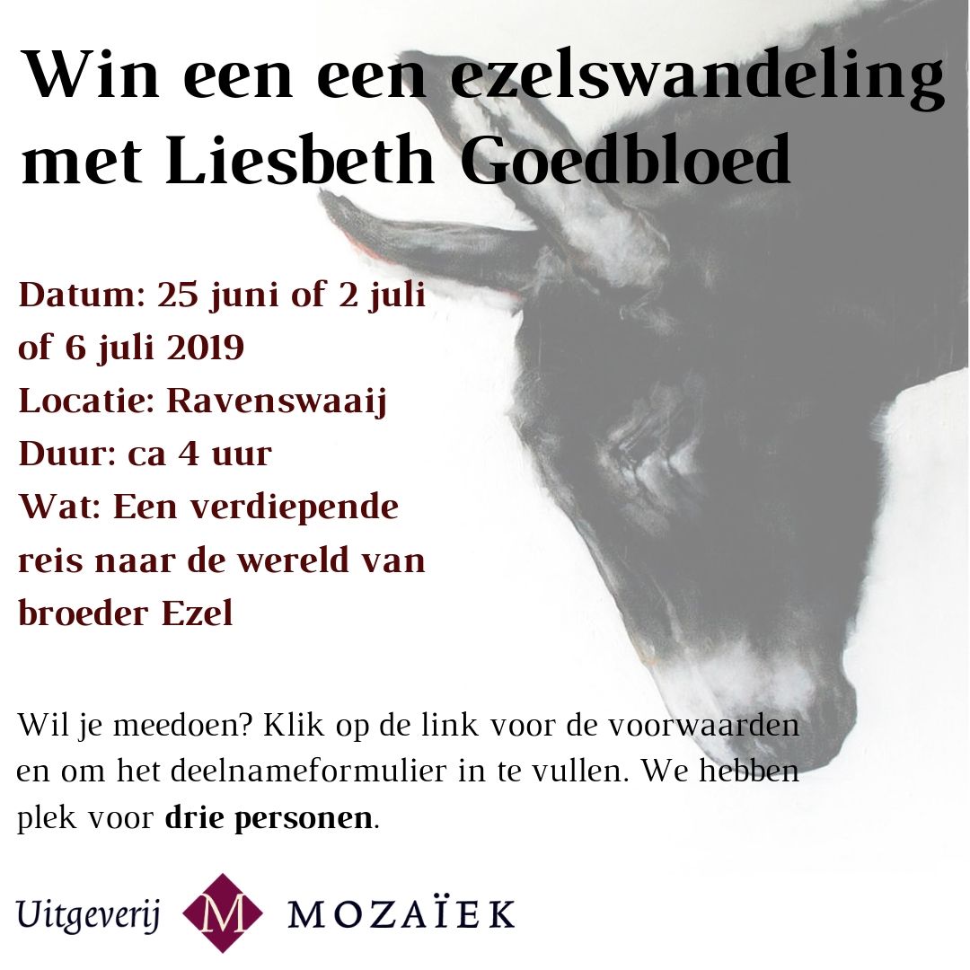 Uitgeverij Mozaïek geeft drie personen de gelegenheid op ezelswandeling te gaan met Liesbeth Goedbloed, de auteur van de roman Broeder Ezel. In haar roman speelt een ezel de hoofdrol, en Liesbeth heeft een speciale voorliefde voor deze bijzondere dieren en ze weet er veel over.